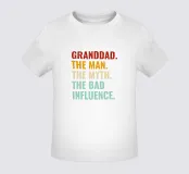 Su uno sfondo verde scuro, un testo in grassetto descrive con umorismo un nonno come "L'uomo, il mito, la cattiva influenza", utilizzando una giocosa sfumatura di colori. I colori vanno dal rosso al giallo e al blu, offrendo un vibrante contrasto.