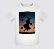 Al calare del crepuscolo, una strega in silhouette vola a cavallo della sua scopa tra i pipistrelli, con una zucca incandescente in primo piano, creando un'atmosfera incantevole.