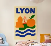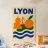 Poster stilizzato di Lione con un gigantesco frutto arancione, la silhouette di una basilica e di un ponte, su uno sfondo di onde blu e verde. I colori vivaci e le forme semplici evocano manifesti retrò, celebrando al contempo il Rodano e l'atmosfera gastronomica della città. Un omaggio grafico e allegro alla capitale della Gallia.