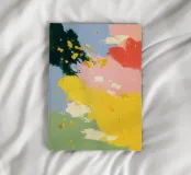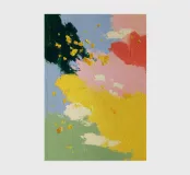 Quadro astratto con grandi pennellate di giallo e rosa brillante, angolo verde in alto a sinistra e nuvole bianche in basso a destra. Le particelle dorate, il cielo blu brillante e la superficie strutturata creano una composizione minimalista e vibrante, piena di energia.