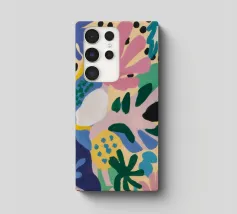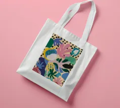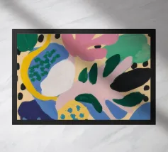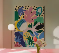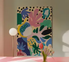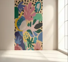 Un motivo astratto chic ed energico che combina macchie leopardate con forme floreali e botaniche stilizzate in una palette di colori vivaci e sofisticati, creando un design selvaggio ma elegante.