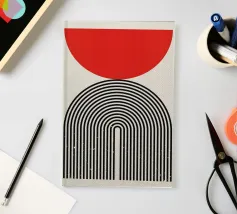 Entrate in una fusione di estetica retrò e modernista con questa sorprendente stampa d'arte astratta. Il disegno presenta un audace semicerchio rosso giustapposto a una complessa disposizione di archi concentrici neri e linee parallele, creando una composizione visivamente avvincente e dinamica che ricorda il design grafico degli anni '70. Questo pezzo incarna sia un giocoso fascino retrò che un'atmosfera pulita e contemporanea. Prodotta con un'impressionante risoluzione di 7000x5000 pixel e 300 dpi, questa arte digitale di alta qualità assicura che ogni linea nitida e ogni tonalità vibrante siano rese con eccezionale precisione, rendendola un'irresistibile aggiunta a
