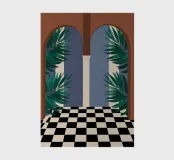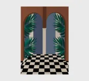 Una vista elegante e intrigante attraverso due porte ad arco, che conduce a una stanza con un audace pavimento a scacchi bianchi e neri, affiancato da piante rigogliose. La composizione crea un senso di profondità e di elegante mistero.