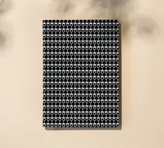 Questa opera d'arte grafica in bianco e nero con motivo a freccia presenta una composizione moderna che si ripete, creando un senso di movimento ed energia. La tavolozza monocromatica dà un senso di semplicità ed eleganza. L'uso delle frecce simboleggia la direzione.