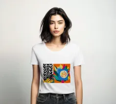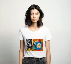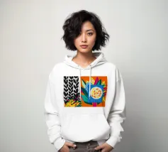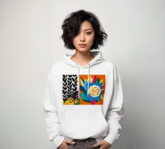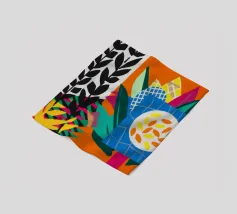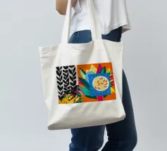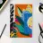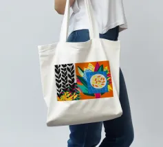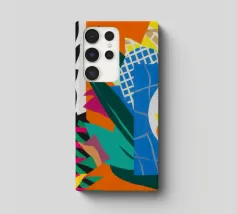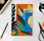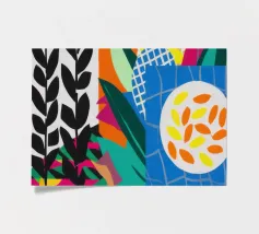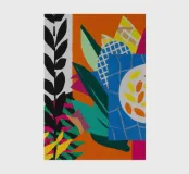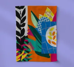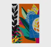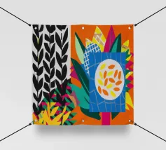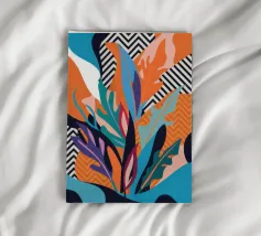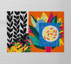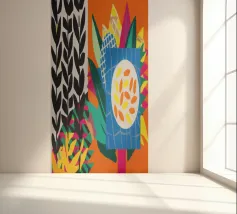 Un dittico che contrappone un motivo geometrico di foglie in bianco e nero a una colorata composizione astratta di forme blu, arancioni e gialle, esplorando motivi e colori.