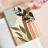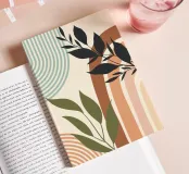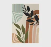 Foglie stilizzate in nero e verde si stagliano su uno sfondo di strisce curve e fluide in morbide tonalità di terra. Il disegno combina elementi botanici con forme geometriche astratte per un look moderno.