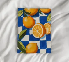 design di limoni, motivo di agrumi, decorazioni per la cucina estiva, illustrazione di frutta, arte a scacchi blu, stampa fresca e vibrante
