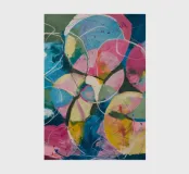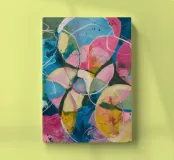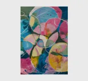 Una composizione astratta e vorticosa di blu, verdi, rosa e gialli vibranti ricorda un fiore che sboccia o una nebulosa celeste. Il movimento dinamico e la ricchezza dei colori creano un'opera d'arte astratta accattivante ed energica.