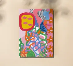 Una composizione astratta vivace e giocosa, caratterizzata da una serie di forme organiche simili a blob in blu, rosa e giallo. Le forme spontanee e i colori energici creano un senso di gioiosa espressione artistica.
