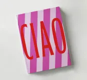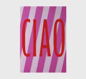 Il poster con la parola italiana "Ciao" a grandi lettere rosse irradia gioia di vivere. Circondato da strisce orizzontali rosa e bianco-rosa, trasmette uno stato d'animo allegro. Questa illustrazione tipografica è il motivo estivo perfetto per i saluti e gli addii.