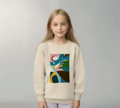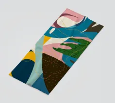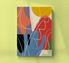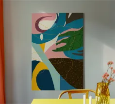 Un dipinto astratto dinamico con forme vorticose e linee fluide in una tavolozza di blu, verde, beige e giallo, che trasmette un senso di energia, movimento e flusso.