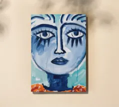 Questo dipinto presenta una maschera dai colori vivaci e dalle forme astratte. La composizione include motivi geometrici, creando un'esperienza visiva dinamica ed energica.