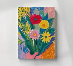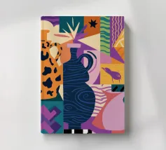 Un vivace patchwork di motivi e fantasie diverse, che combina elementi floreali, forme astratte e disegni di piastrelle. L'eclettico mix di colori e stili crea una composizione visivamente ricca e gioiosa, che ricorda una parete di piastrelle del Mediterraneo.