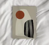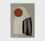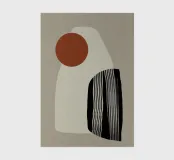 Composizione astratta con un audace cerchio rosso, una forma beige e una forma nera a righe. Le linee pulite e i toni tenui offrono un'estetica moderna.