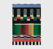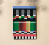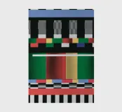 Forme geometriche vibranti e colori decisi creano una composizione dinamica e astratta. Barre e blocchi orizzontali di varie tonalitร  sono intervallati da motivi a strisce bianche e nere che aggiungono contrasto e ritmo.