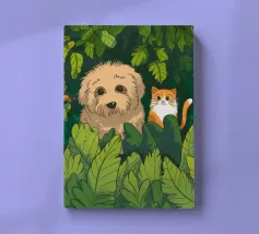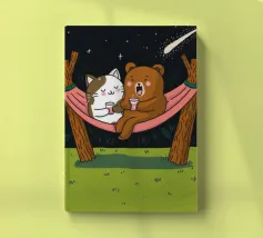In un giardino stravagante, un orso tiene in mano una succosa anguria circondata da frutti e da un albero rigoglioso. Questa vivace composizione celebra l'abbondanza e la dolcezza della natura.