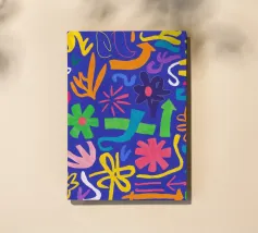 Una griglia gioiosa e colorata è riempita da una varietà di motivi e icone giocose, tra cui fiori stilizzati e forme astratte, che creano un design allegro e decorativo.