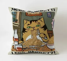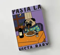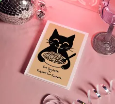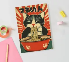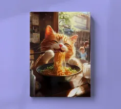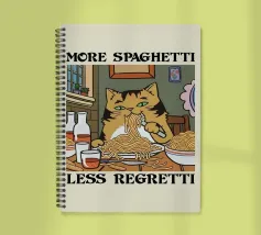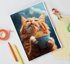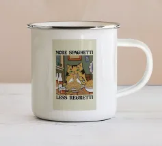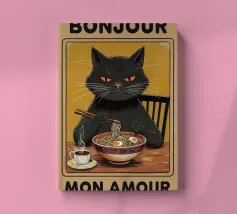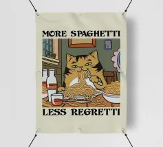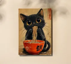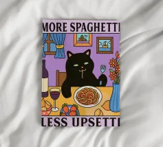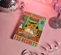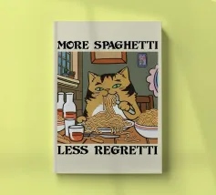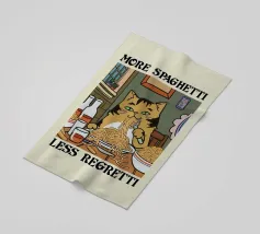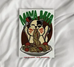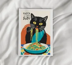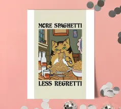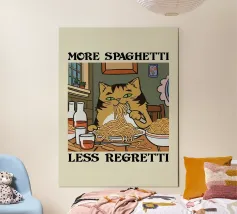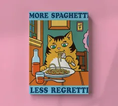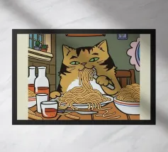 Questa giocosa opera d'arte raffigura un gatto soddisfatto che si gode un abbondante piatto di spaghetti, irradiando conforto e umorismo. Con il suo stile retro comico e la frase spiritosa "Più spaghetti, meno rimpianti", ricorda di assaporare i semplici piaceri della vita. Perfetto per gli amanti del cibo, per gli appassionati di gatti e per tutti coloro che apprezzano una motivazione spensierata.