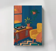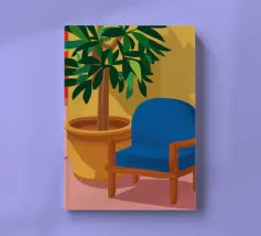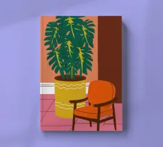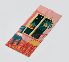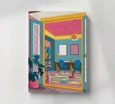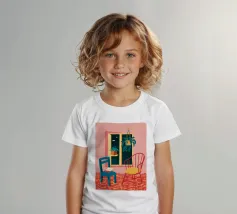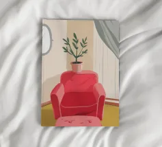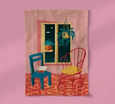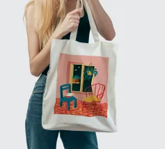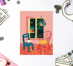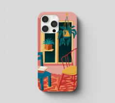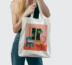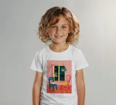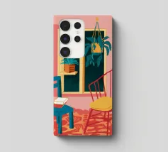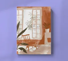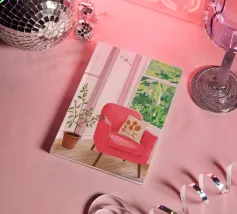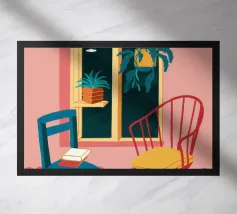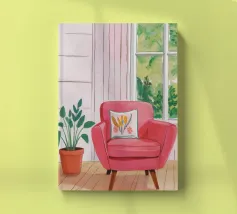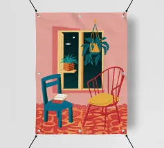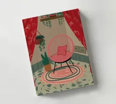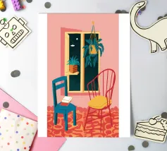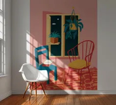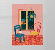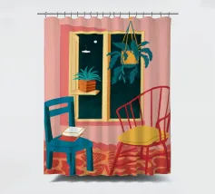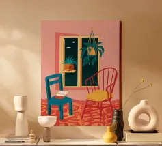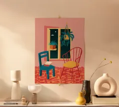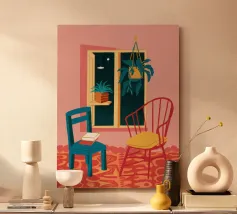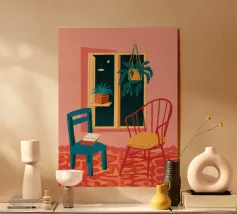 Una persona siede su una sedia di legno in un'accogliente stanza rosa, guardando fuori dalla finestra il cielo notturno. La scena è pacifica e introspettiva, con una pianta appesa che aggiunge un tocco di natura alla calma dell'ambiente interno.