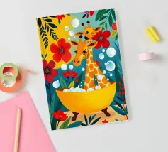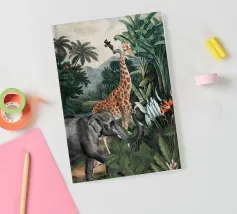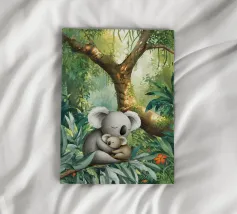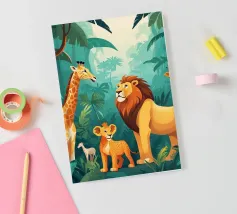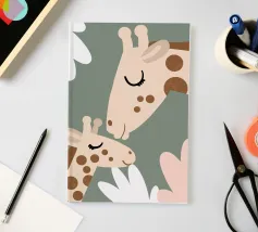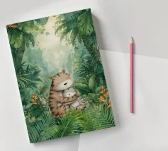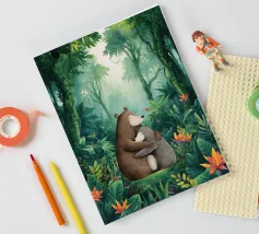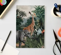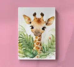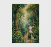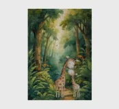 Portate calore e serenità nel vostro spazio con questa incantevole opera d'arte ad acquerello che raffigura una madre affettuosa e un cucciolo di giraffa che condividono un momento di tenerezza in una lussureggiante foresta tropicale. Perfetto per le camerette, le stanze dei bambini o gli interni ispirati alla natura.