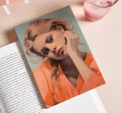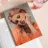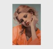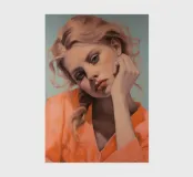 Giovane donna vestita di un vivace colore arancione, che appoggia la testa rilassata sulla mano. Gli occhi azzurri e le labbra carnose conferiscono all'opera un'eleganza moderna.
