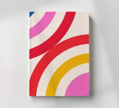 design retrò, estetica rosa, arcobaleno astratto, linee curve, strisce colorate, vibrazioni vintage, arte rossa e rosa, minimalismo astratto, ispirazione anni '70, tendenza arredamento moderno, motivo geometrico, palette di colori audaci