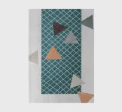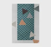 Le forme geometriche sono disposte su uno sfondo strutturato, caratterizzato da un motivo a griglia verde acqua. I triangoli di varie tonalità creano un contrasto visivo dinamico.