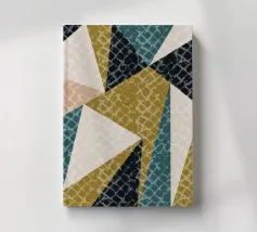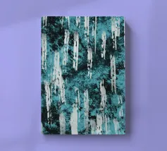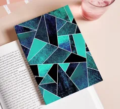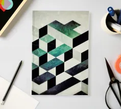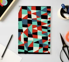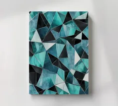 Arte digitale con un motivo astratto triangolare in turchese e bianco. Gli accenti neri creano contrasto, mentre una sottile texture grunge aggiunge profondità e carattere al disegno geometrico.