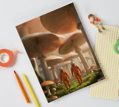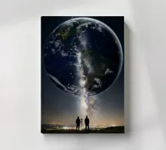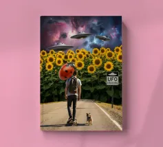 Questa fantasiosa opera d'arte fonde meraviglia fantascientifica e bellezza naturale. Due escursionisti si trovano in una foresta lussureggiante e guardano la Terra che si profila incredibilmente vicina nel cielo, mentre gli UFO si librano sopra di loro, proiettando fasci di luce brillanti. Un vistoso cartello di avvertimento "Zona di discesa" aggiunge umorismo e avventura alla scena surreale. Ricchi dettagli, elementi cosmici e un'atmosfera cinematografica rendono questo pezzo perfetto per gli appassionati di arte extraterrestre, paesaggi fantastici e decorazioni murali uniche che stimolano la curiosità e la conversazione.