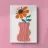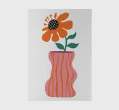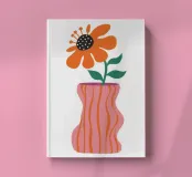 Illustrazione minimalista e moderna di un singolo grande fiore arancione in un unico vaso rosa ondulato su sfondo bianco. Il pezzo è chic, semplice e con una forte qualità grafica.
