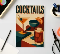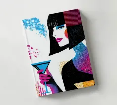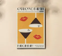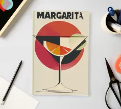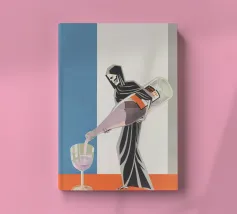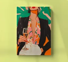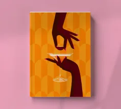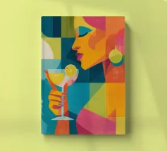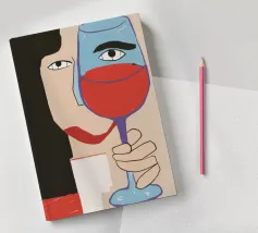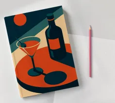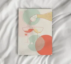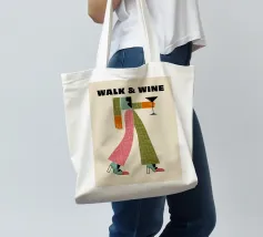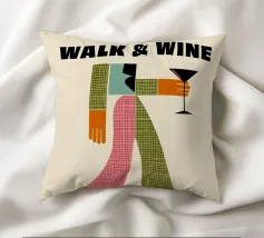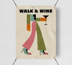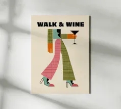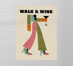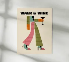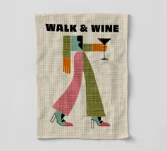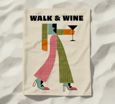 Il motivo "Walk & Wine" mostra una figura geometrica stilizzata che cammina con un bicchiere di vino in mano. Disegnata con colori vivaci come il verde oliva, il rosa e il turchese, l'immagine combina moda, movimento e piacere del vino in modo umoristico. Il design minimalista, con forme chiare e fascino retrò, lo rende una dichiarazione moderna per gli amanti del vino e del design.