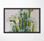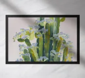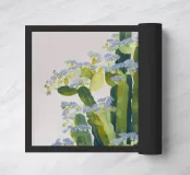 Questa delicata opera d'arte raffigura cactus verdi con fiori azzurri, dipinti in tenui colori pastello. La combinazione di toni morbidi di beige e verde conferisce al motivo un'atmosfera calda e naturale. Ispirato alla botanica del deserto, il risultato è un quadro vegetale minimalista con una leggerezza estiva.
