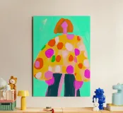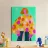Una figura vibrante e ritagliata della Pop Art massimalista che mostra una moda audace e un colore espressivo. Il soggetto indossa un maglione giallo a collo alto e oversize, ricoperto da grandi pois astratti con spesse pennellate espressioniste di rosa caldo, arancione, bianco e verde smeraldo. Questo energico disegno è nettamente contrastato da pantaloni di un profondo blu navy e da uno sfondo dominato da una texture di un brillante verde acqua/teal, creando uno scontro cromatico scioccante ma gioioso. La texture tattile della vernice dà l'illusione di un dipinto a olio spontaneo. Il pezzo incarna perfettamente il Decoro Dopamina e la gioiosa maxi