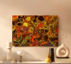 Opera d'arte astratta con molta energia ed emozione, colori forti e brillanti (rosso, giallo, nero), forme e linee emozionanti. Fuoco e acqua.