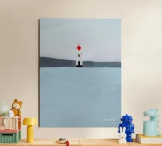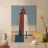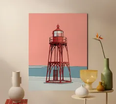 Questa moderna illustrazione del faro di Hörnum adotta un approccio unico al colore e alla forma, creando un'impressione visiva minimalista ma potente. Le tonalità rosse e bianche della struttura sono accostate a uno sfondo accuratamente composto di blu tenui e neutri sabbiosi, che imitano i toni del paesaggio costiero del Mare del Nord. Con le sue linee pulite e l'influenza astratta, questo pezzo cattura lo spirito della cultura marittima di Sylt in modo contemporaneo e senza tempo.