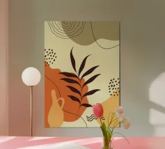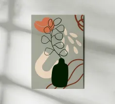 Linee astratte e blocchi di colori tenui creano una composizione moderna dall'estetica minimalista. La forma stilizzata di una pianta e quella semplice di un vaso aggiungono elementi organici, in contrasto con le forme geometriche.