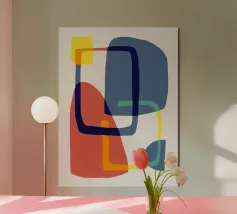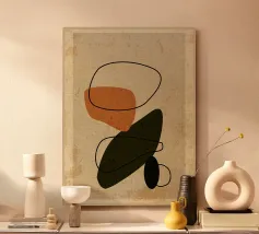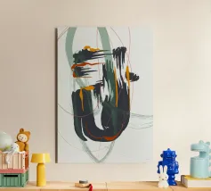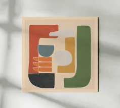 Forme astratte e linee decise si fondono in un equilibrio di colori tenui, creando una composizione dinamica. Le forme organiche si intrecciano, mentre sprazzi di verde aggiungono profondità e movimento.