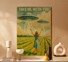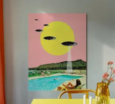 Alieni nelle loro astronavi UFO che cambiano dimensione dallo spazio esterno a un villaggio tra le montagne in Norvegia. Una donna retrò degli anni '50 osserva il fenomeno, sperando di non essere rapita. Surreale collage di arte fantascientifica retrofutura di MsGonzalez.