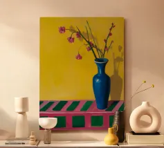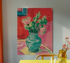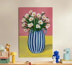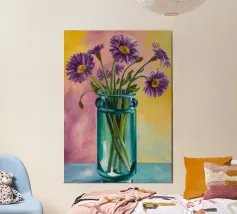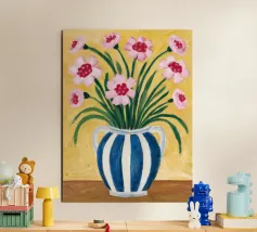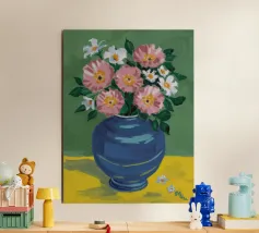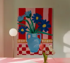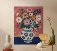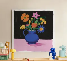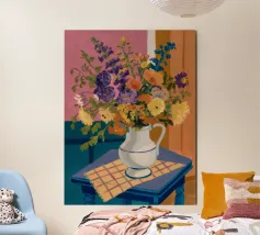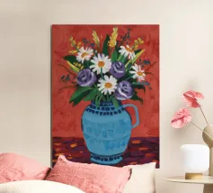 Una vivace serie di fiori di campo colorati disposti in un vaso blu. Lo sfondo è di un rosa strutturato e modellato, creando una composizione ricca e gioiosa, piena di vita e di colore.