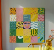 Una composizione astratta vibrante ed energica con un volto stilizzato integrato in un patchwork colorato di motivi geometrici. L'opera è un'esplorazione moderna e giocosa dell'identità e della forma.