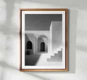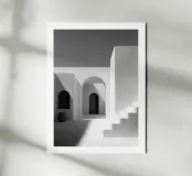 Poster in bianco e nero di architettura minimalista: archi, porte e scale immerse nella luce. Una texture a stucco, linee pure e un gioco di ombre grafiche creano un'atmosfera mediterranea di calma, design e Zen. Perfetto per un soggiorno, una camera da letto o un corridoio, questo elegante poster aggiunge profondità, modernità e raffinatezza alle pareti e si abbina perfettamente a un arredamento contemporaneo scandi o giapponese.