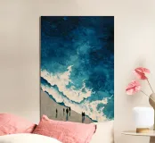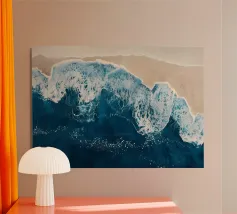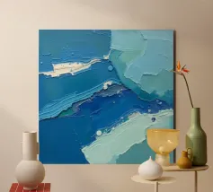 Quest'opera d'arte cattura una potente prospettiva aerea di onde che si infrangono su una costa tranquilla, dipinta con texture dense ed espressive. I blu profondi si dissolvono in toni turchesi più chiari, mentre le onde bianche e spumeggianti formano un confine dinamico tra movimento e immobilità. Piccole figure umane sulla riva enfatizzano la scala e la contemplazione, mettendo a terra la vasta energia del mare. In equilibrio tra astrazione e realismo, la composizione esplora il contrasto, il ritmo e l'attrazione emotiva dell'oceano, rendendola un'opera di grande impatto per interni moderni e stampe artistiche di grande formato.