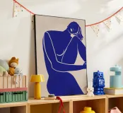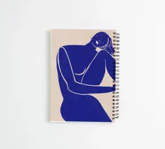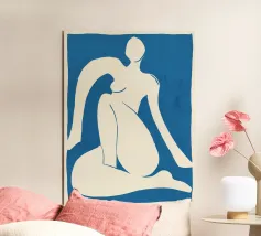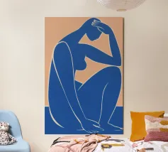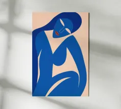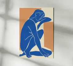 La silhouette blu di una figura umana si staglia su uno sfondo color crema, in una posa contemplativa con un braccio appoggiato sul corpo e l'altro dietro la testa. Lo stile minimalista trasmette emozioni attraverso linee semplici e colori solidi, garantendo un forte impatto visivo.