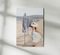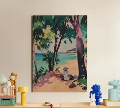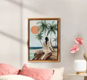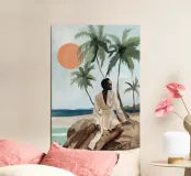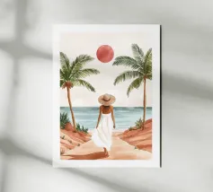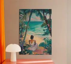 Grazioso dipinto digitale di una donna sicura di sé in una fluente vestaglia bianca seduta su una spiaggia rocciosa con palme e un vibrante sole arancione. Questa elegante e serena scena costiera evoca lusso, calma e vibrazioni tropicali. Perfetto per gli amanti della moda, dell'arte moderna e dell'arredamento tropicale. Aggiunge raffinatezza e calore a soggiorni, camere da letto e uffici. Regalo ideale per i collezionisti d'arte e gli appassionati di ritratti contemporanei ispirati alla spiaggia.