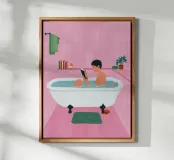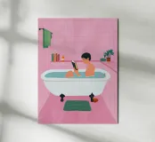 Vista dall'alto di una persona che si rilassa in un bagno di schiuma, leggendo un libro. La scena in un bagno piastrellato di rosa è una rappresentazione perfetta della cura di sé, della tranquillità e della fuga pacifica.