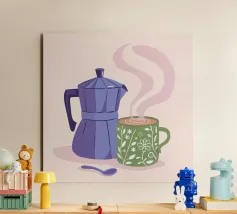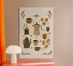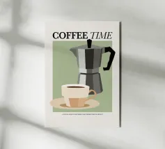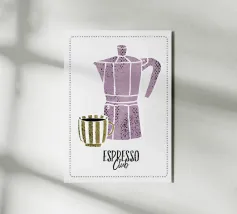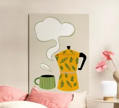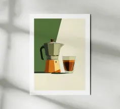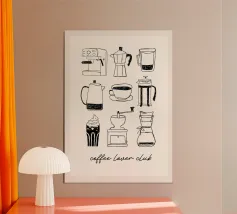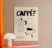 Illustrazione in bianco e nero con caffettiera, chicchi di caffè e scritta "Caffè? Design pulito con un tocco retrò, perfetto per gli amanti del caffè e per le pareti delle cucine moderne.