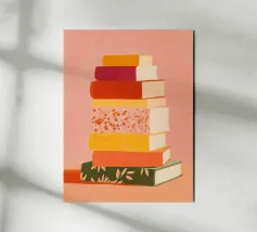 A stylised, charming still life: Four differently designed books are arranged in a pile, on which a white coffee cup with black coffee is enthroned. The background is a warm, textured shade of red that radiates cosiness. The book covers vary from star-speckled dark blue to striped blue and white with abstract patterns. The illustrative style is hand-drawn, with clear shapes and soft textures - ideal for a relaxed, creative atmosphere.