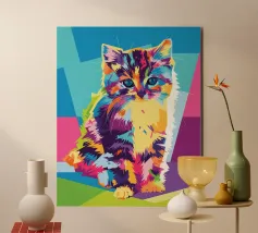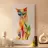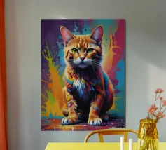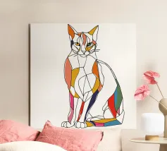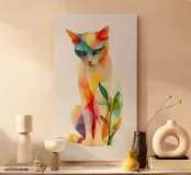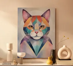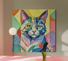 Una vivace illustrazione geometrica di un gatto seduto con forme sovrapposte dai colori dinamici, abbinata a elementi astratti a forma di foglia per un design moderno e creativo.
