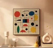 Un insieme di forme colorate, in particolare cerchi e linee, crea una composizione dinamica. L'uso di colori primari aggiunge un'atmosfera vibrante e moderna.