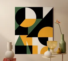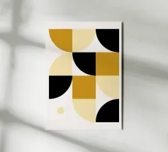 Audaci curve nere si intrecciano con un vibrante quadrato dorato al centro, creando una composizione dinamica e astratta. Il gioco di contrasti tra luce e buio aggiunge profondità e movimento al disegno.